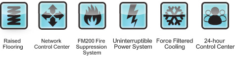 The facility is equipped with a FM200 fire suppression system, designed to immediately extinguish fire and protect servers and equipment.
